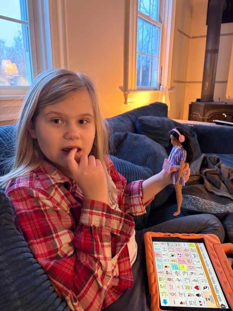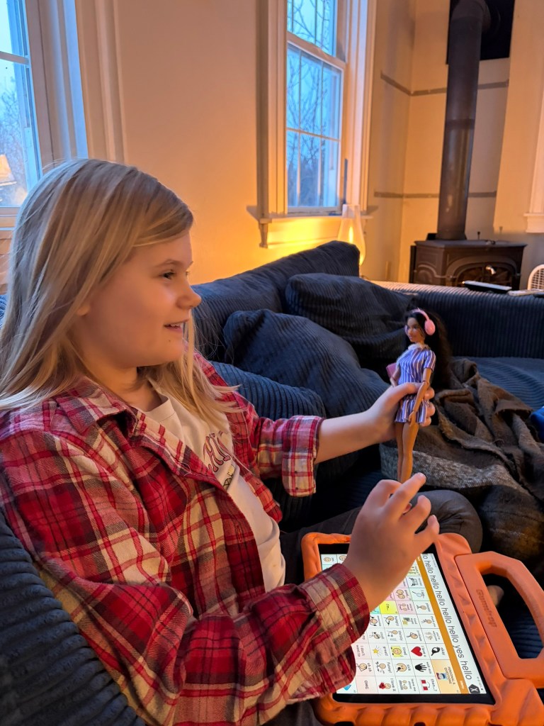 When Daph opened the doll, I showed her all the ways the doll was similar to her. She listened quietly before she pointed to the doll’s AAC tablet, looked at me, and smiled. Daph loves her own tablet, what we call her “talker,” so I think she knew immediately how important it was to this Barbie.