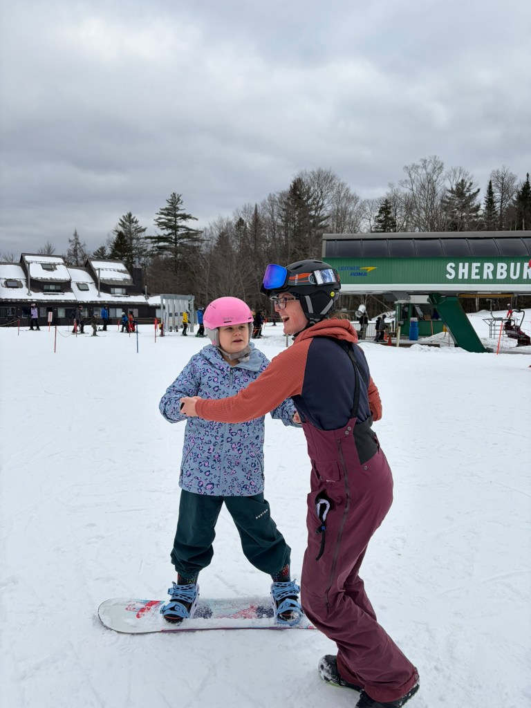 I was skeptical, I’ll admit. What exactly would she do while her classmates had their lessons with the Burke Mountain staff? Would I have to pull her around on her snowboard while she watched her peers go “falling leaf” on their heels down the bunny hill? Would she end up just playing in the snow until enough time crept by for me to finally load her up in our Subaru? Would she be able to ride the bus up to the mountain with her peers, or would the engine and diesel fumes overwhelm her, and I’d have to drive her myself? I was prepared to do all these things so she could be included, but I wasn’t sure they would add up to any kind of meaningful experience.