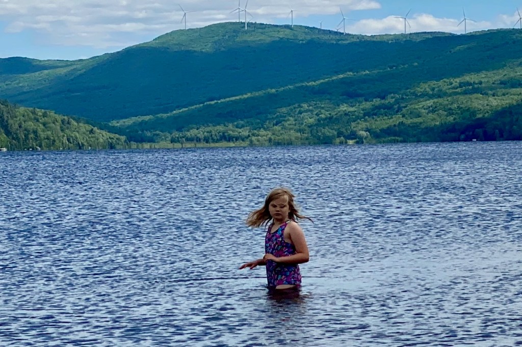 Sunday, however, was better. Our neighbor invited us to join his family for swimming in Island Pond, a town about thirty minutes north of ours. I’m always eager to find new swim spots, so we got ready for a lake day and hopped in the car. After struggling to find the right spot–stopping first behind a retirement home at a tiny beach covered in goose shit–we made it to the right place, Brighton State Park, a lovely swim beach with soft, cleaner sand and hygienic restrooms. The view of the village’s buildings, including two white steeples, across the expansive water was gorgeous in a classic New England way, and the water was the warmest it’s been this summer. We all had a blast, and Jer got to see how well Daphne’s regained her float after going without swim lessons for the last four years.