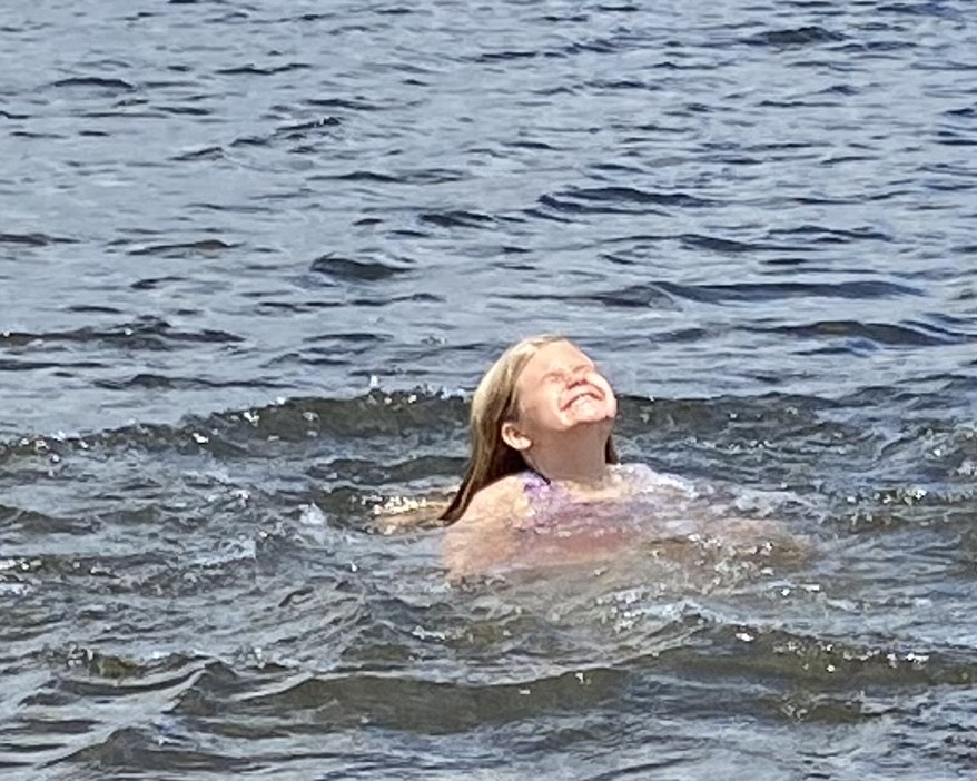 Daph was so happy midswim at Island Pond that, at one point, she sat in the shallow water, stretched out her legs, then just lay down beneath the surface, totally submerged before popping back up. Jer made the joke that her little, lone arm might emerge holding a magical sword like Excalibur. A miniature Vivian, a little Lady of the Lake.