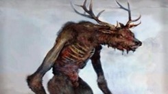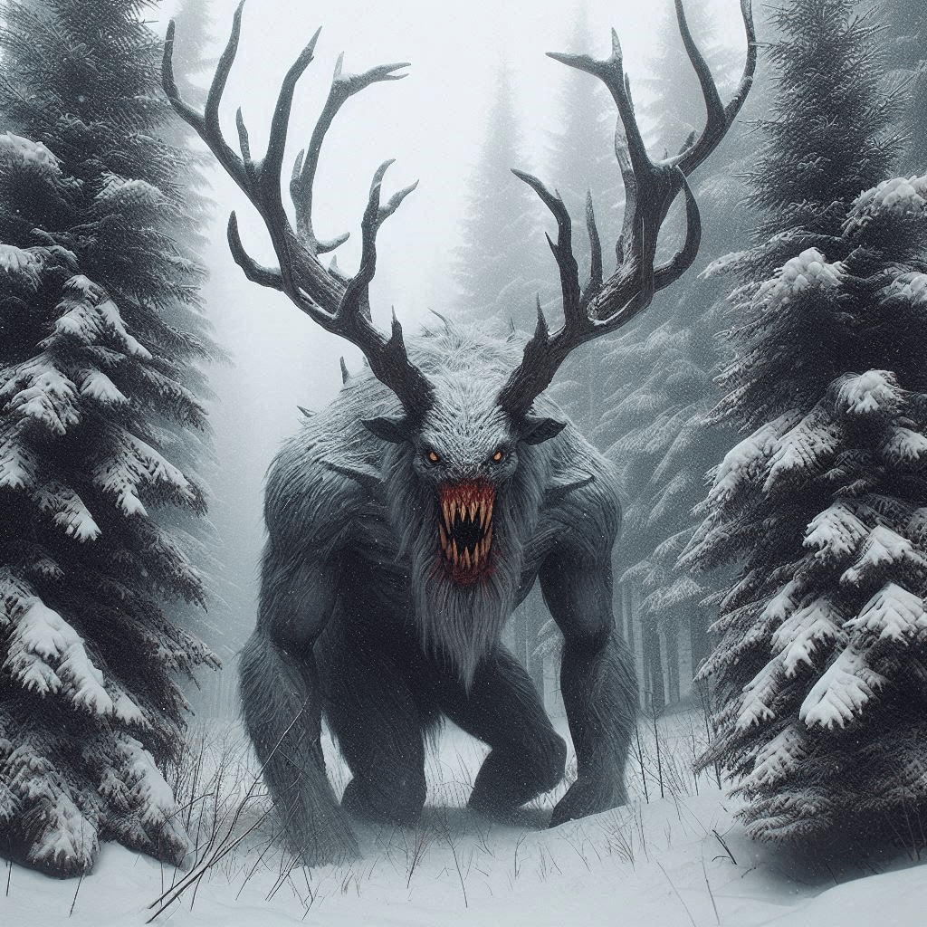 According to Britannica Online, wendigos come from Algonquian tribal folklore, and they’re either cannibalistic monsters or evil spirits that possess humans, and they’re associated with winter. They’re often gaunt and gray-fleshed or enormously tall, with sunken/glowing eyes, sharp and yellowed fangs and claws, and pointed ears or horns or deerlike antlers. They smell of rotting flesh, which, it’s said, is how humans can detect them.