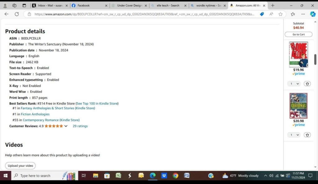 Most recently, I’ve enjoyed the sense of accomplishment and camaraderie I think we’ve all felt in RHS’s 2024 anthology, All The Promises We Cannot Keep, which released this past Monday. The collaborative marketing has been fun, and our book continues to do well, ranking #1 in Fantasy Anthologies & Short Stories and #1 in Fiction Anthologies in general, as of early this morning. The average customer rating? 4.9/5 stars.