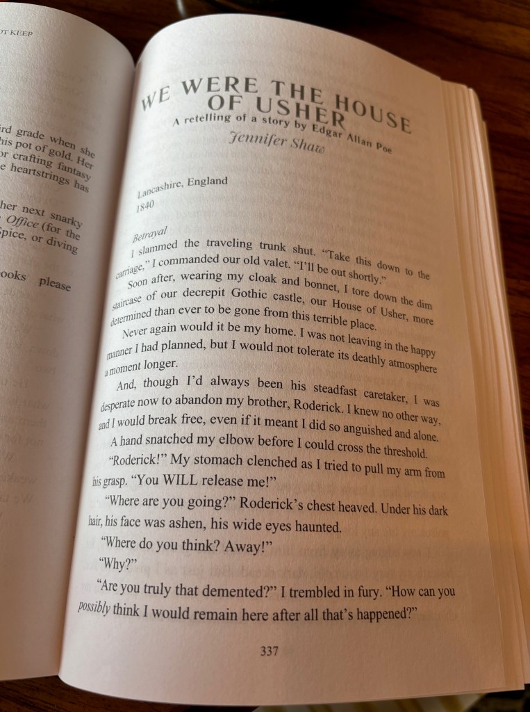 When she was here in April, in fact, I’d just finished an early draft of my Usher retelling for ATPWCK. I needed to know how a general reader would respond to this piece, especially someone who wasn’t familiar with the original story because I wanted my retelling to be clear and engaging even for people who weren’t familiar with Poe’s “The Fall of the House of Usher.”