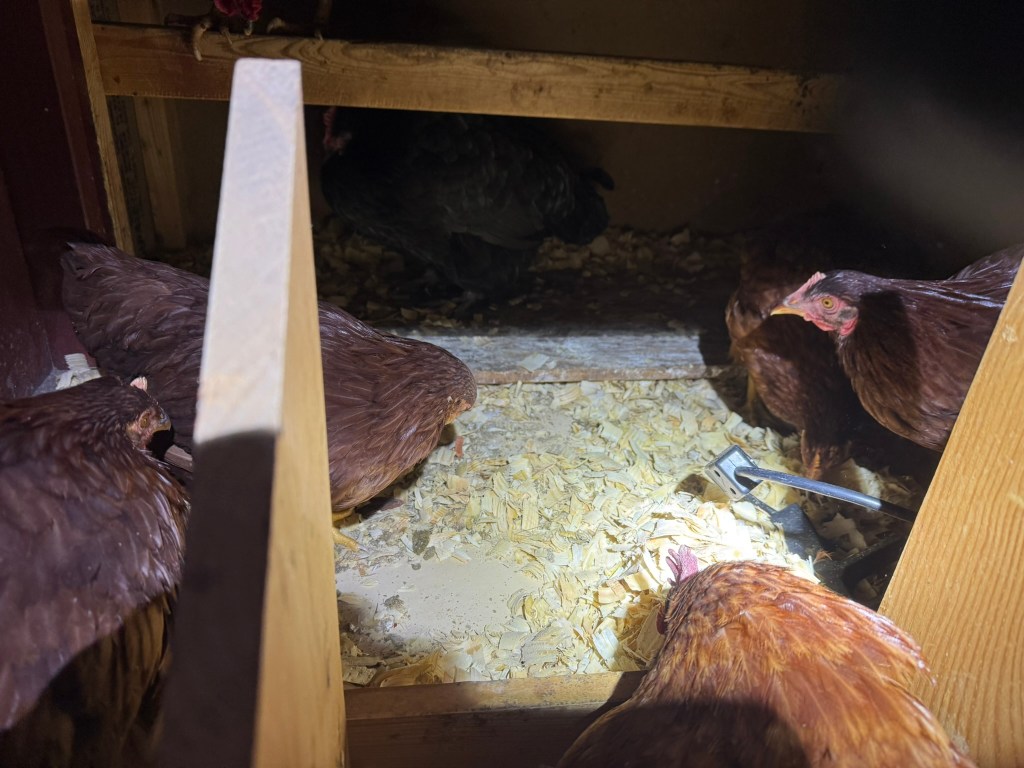 They’ve graduated now to roosting on the low ledge that divides the nesting boxes from the floor of the main area. That’s still not where they’re supposed to be, but at least they have the idea. I believe they’ll make it onto the proper bar eventually.