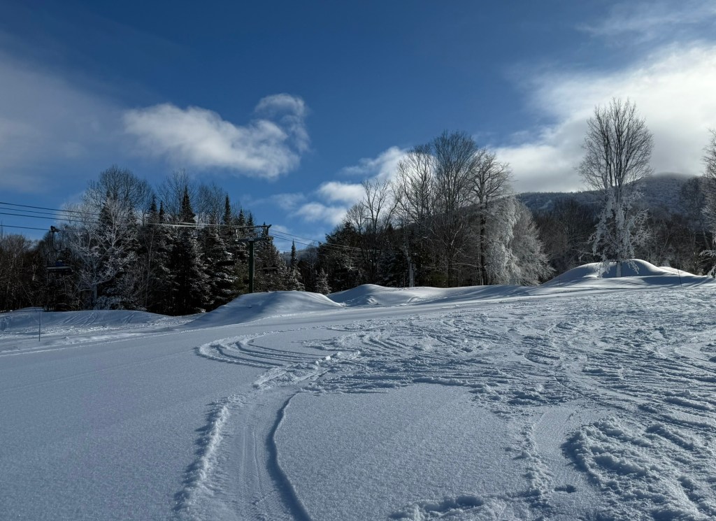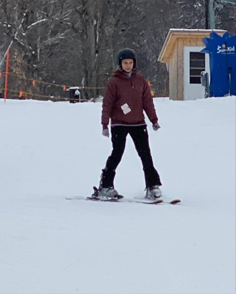 I’m still a newbie skier, even after almost four years here, so I stick to the bunny hills (or the Learning Area as they’re officially called). I learned the fundamentals on those shallow, short runs pretty quickly back in 2022–“pizza pie” and “french fry,” as the instructors like to say, meaning how to V my skis so I didn’t zoom straight down, and how to bend my leading knee, shift my weight, and use the edges on both skis to move into a parallel position to turn as needed. I’d been working on my form and control ever since, but only on those easy, inviting hills.