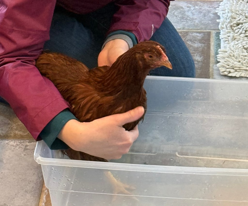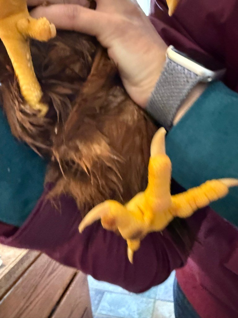 When she wasn’t soaking, we kept her in a cat carrier in our bathtub to keep her feet relatively clean so they could heal. The swelling decreased enough for us to feel comfortable putting her back outside, but she’s still not moving around well. Whether that’s from the lingering infection or the Marek’s Disease we suspect she has, I don’t know. She’s always been undersized, with short legs and awkwardly large toes. She’s never had a smooth gait and right now, she can’t even scratch in the dirt. She’s terrified of Doris, who pecks her on the head. She is eating, drinking, and moving in and out of the coop alright, but she’s not ranging with her sisters. Her quality of life isn’t great, and she’s especially vulnerable to predators. I worry we won’t have her very long.
