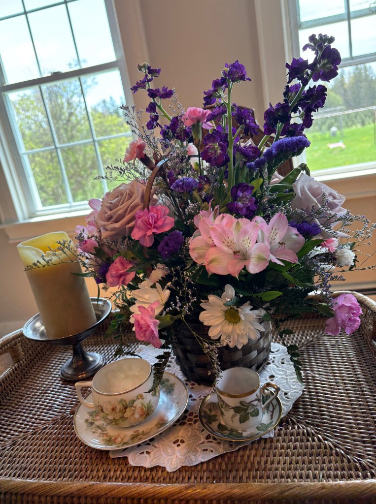 On a final note, I had a delightful Mother’s Day. My husband spoiled me with a gorgeous flower arrangement and a package of Pilates classes, which I desperately need given how stiff I am.
