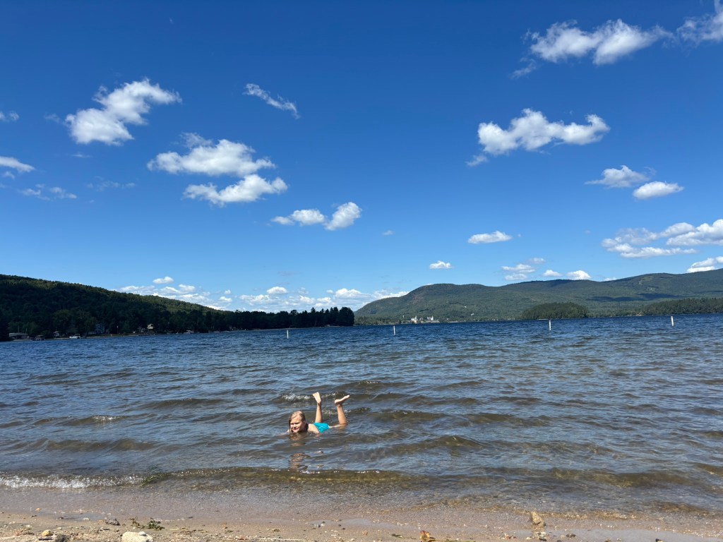 Of course, we’ve done a ton of swimming–in the saltwater pool at Wildflower Inn, in Crystal, Willoughby, Island Pond, and Maidstone Lakes, and at the beach in York, Maine. At York, the waves were high and the water choppy thanks to the hurricane just off the coast. The red flags were flying, signaling that undertows were likely and swimming was forbidden.