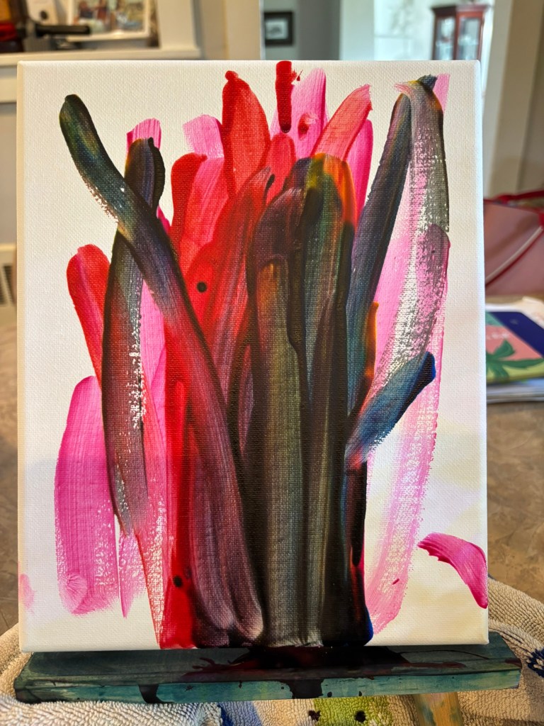 She’s done more painting, too. We gave a new one to her Grammy and Munka for hosting Jer’s 50th birthday celebration. The most recent one, done on the first of her larger canvases, we’re mailing to her Grandma and Grandad.