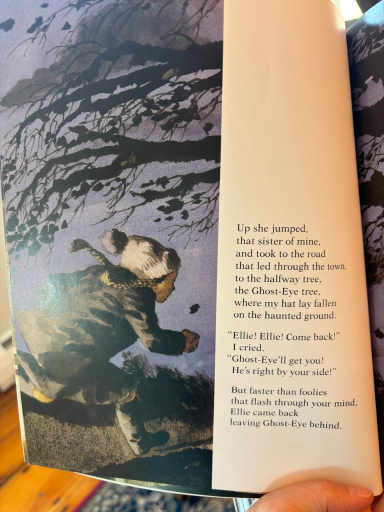 Now, I appreciate the folksy rhythm of the verse and the sweetness of the underlying story, what it’s really about–two siblings experiencing a surprising moment of tenderness. Ellie, the narrator’s sister, runs back to the terrifying ghost tree to rescue her little brother’s special hat, blown off his head when the tree scared them on their way home from fetching milk.