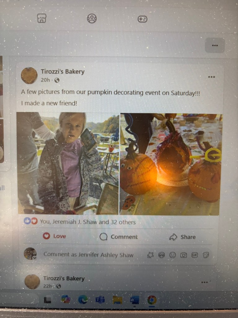 Speaking of pumpkins, we took Daph to a pumpkin decorating event at our favorite pizza place, Papa Tirozzi’s Bakery. She did a fabulous job tying a mermaid tail to her chosen gourd and pressing stickers and rhinestones on its surface, a great fine motor activity.