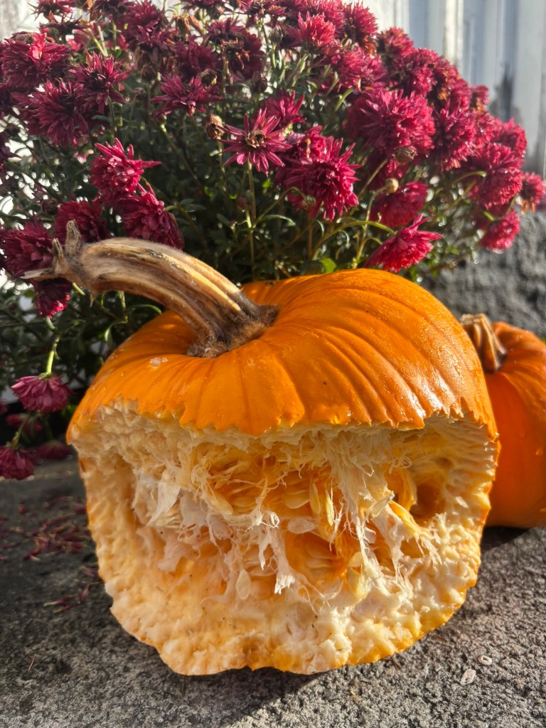 I harvested nine beautiful orange pumpkins from our garden. Most of them I left outside on display, but you can see they’ve become oversized hen treats.