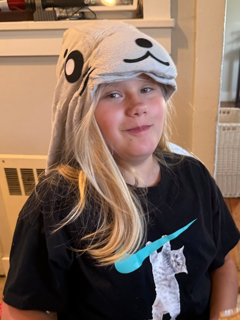 This is the third autumn, for example, that she’s been able to tell us via her AAC software, TouchChat (on her speech-dedicated i-Pad or “talker,” as we call it), what she wants to be for Halloween. In 2023 it was an elephant.