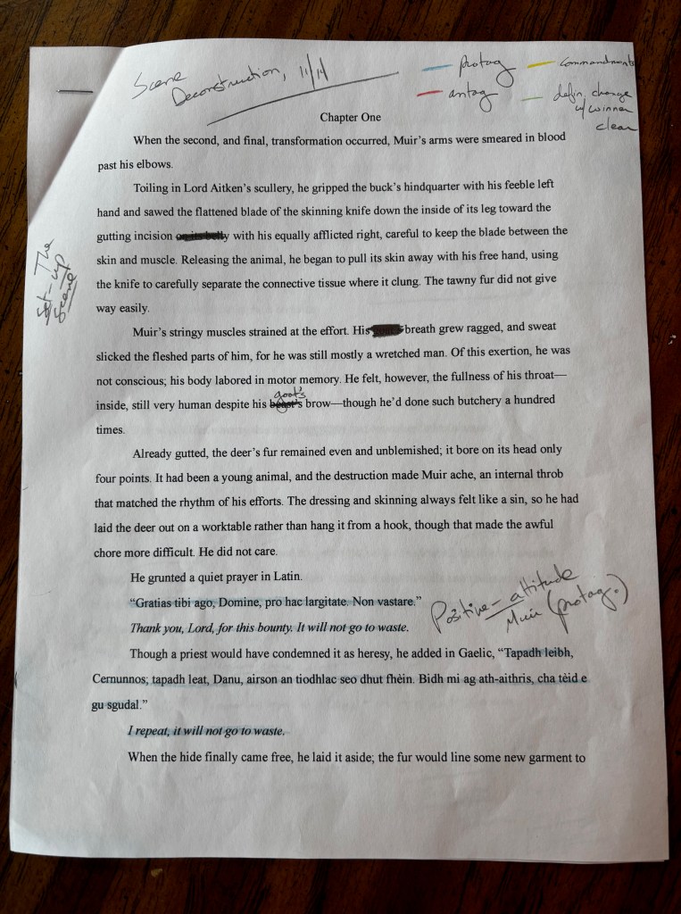 This scene, which sets up the entire novelette, is very much a working draft. I find it interesting that a visual scan reveals over half of it is spent grounding readers in character, setting, and tone before the inciting incident occurs. This might suggest there’s too much grounding, given the proportions between that and the storytelling commandments.