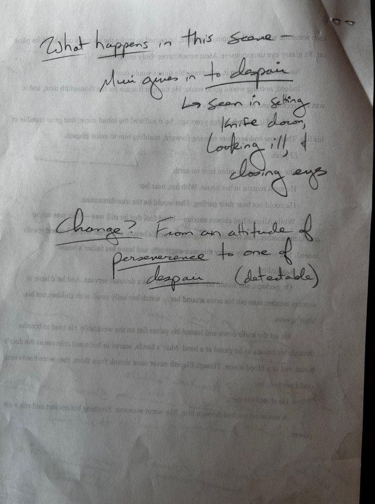 This year, I’ve concentrated on developing effective scene structure, and the following photos show the self-edits/reflections and highlights for structure I’ve already completed on these two pages.