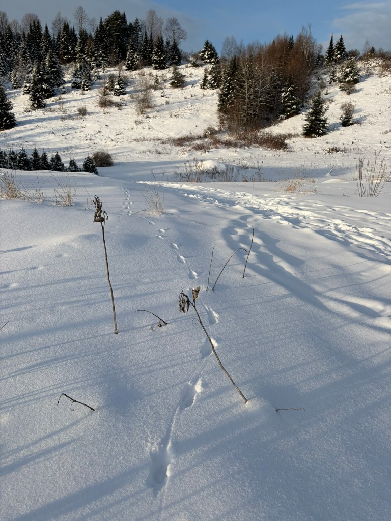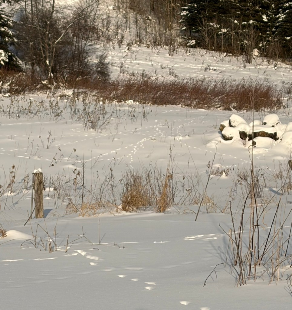 He was no longer a boy. Yet, when that first December powder coated the landscape, and the mounds on the fence posts looked like gumballs of white, he couldn’t help but scan the earth for animal tracks. Deer, he mostly observed, and turkeys, fox, mice, the occasional rabbit, and even black bears, if it was early enough in the season. Sometimes, the enormous cloven prints of a moose’s hooves. The larger animals’ tracks, straight or winding, formed clear, often intersecting paths that emerged from the forest to head up the western hill toward the underground spring. There, water could be found even when most of the earth’s surface froze. Or, they ran the reverse, the tracks moving downward into the dark mass of pine and fir.
