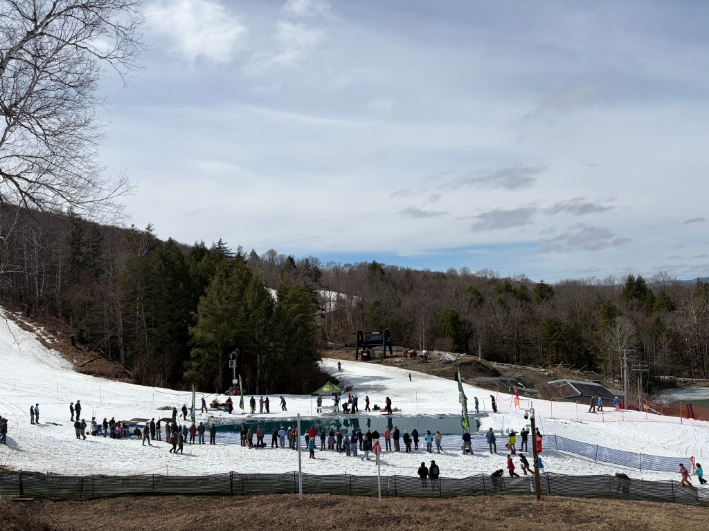 The changing season also means Burke Mountain, our local ski resort, is about the close, but not before holding their annual pond skim, which happened last Saturday, April 4th. They titled this year’s event Pond Voyage (click that link to see a fab video!) and our family went to see it. I’d never been to a pond skim, and it was a straight-up party! Daphne loved it too, so much so that she wanted to stay for the entire thing.